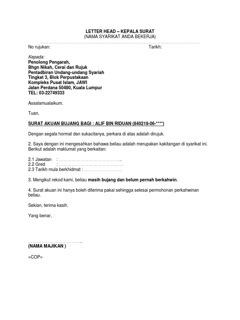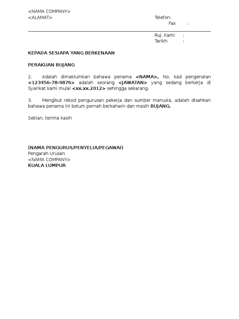 Contoh Surat Perakuan Bujang Pdf